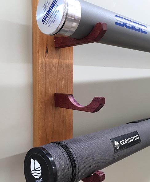 We also offer a horizontal, wall-mounted storage solution for your tubes, similar to our original Nice Fly Fishing Rod Racks. Available with space for 2-22 tubes, with single or double pegs, and in your choice of Cherry, Beech, or Mahogany.
