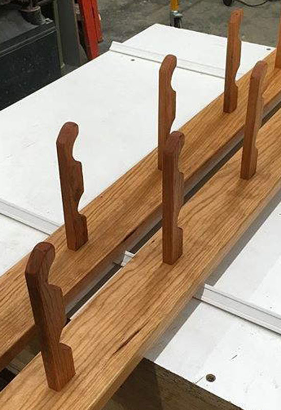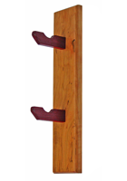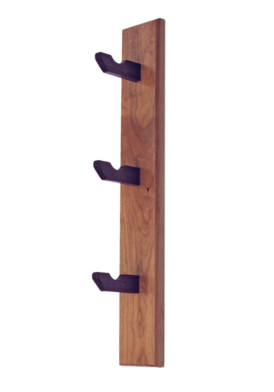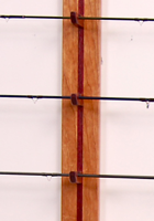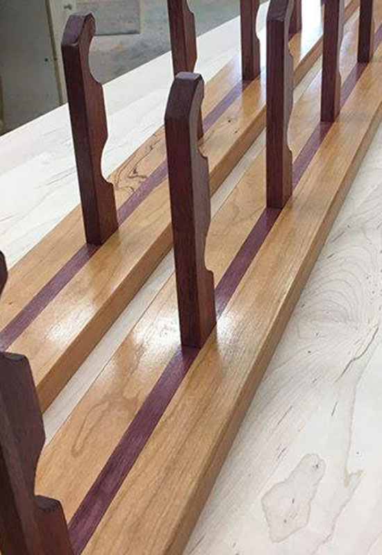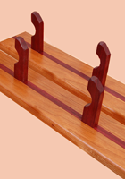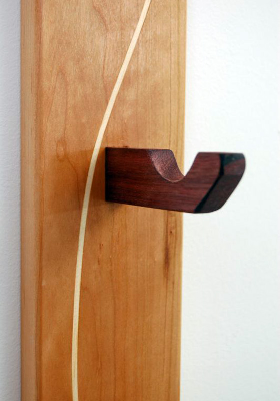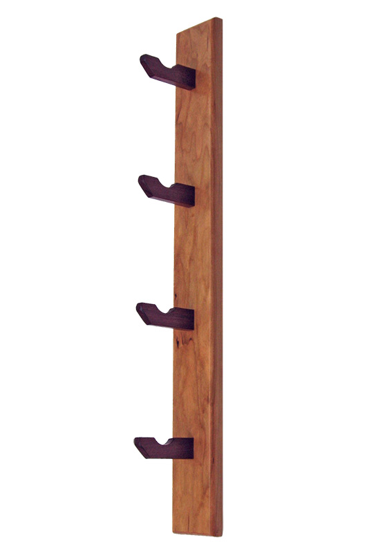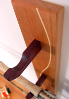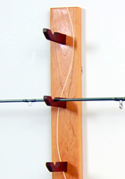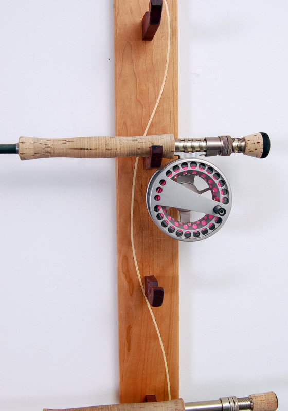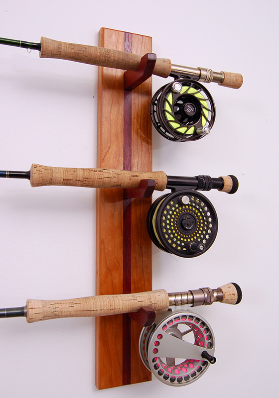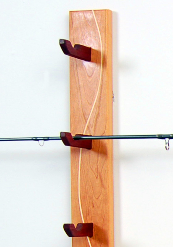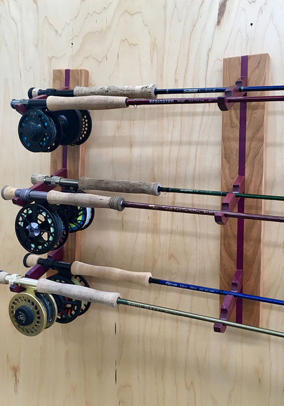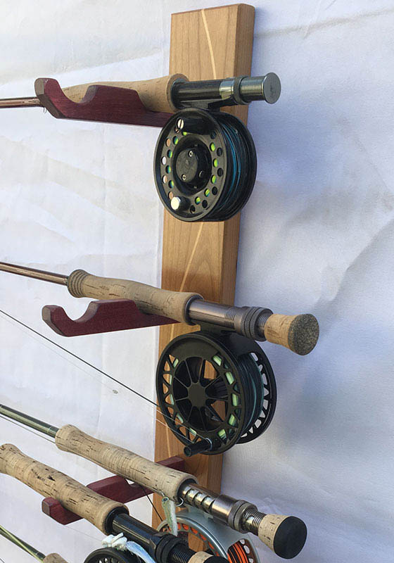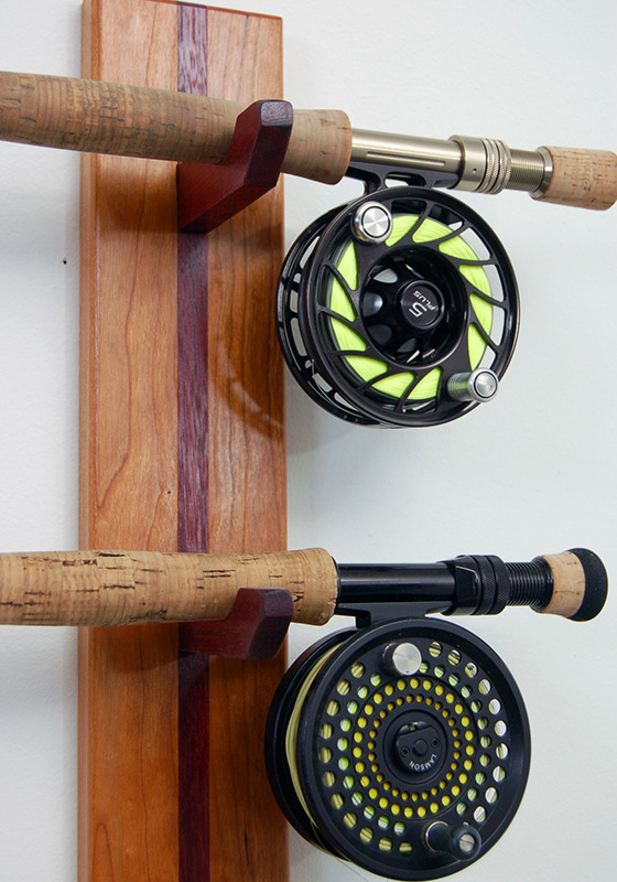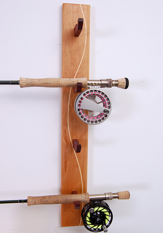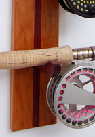 Our Fly Rod Racks come in three flavors: standard, with a straight purple heart wood inlay, or with a curved light wood inlay – all handmade to the