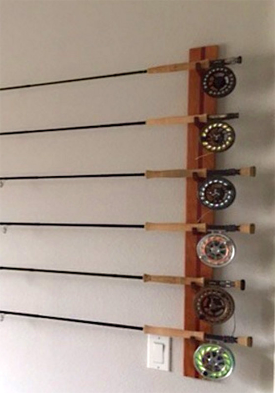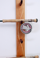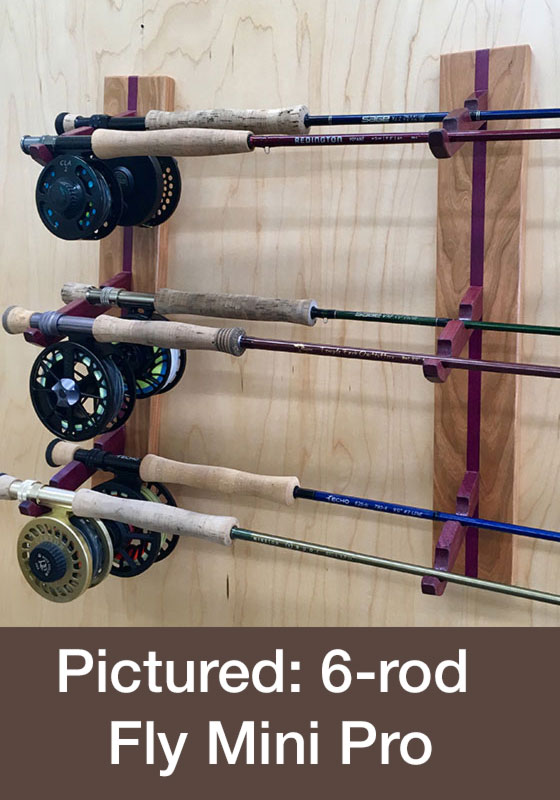 The racks are available as single rod rack or double rod rack versions. Our Mini Fly Rack Pro stores and displays your fly rods staggered in a beautifully inlayed rack and we also have a vertical fly rod storage solution.
