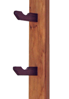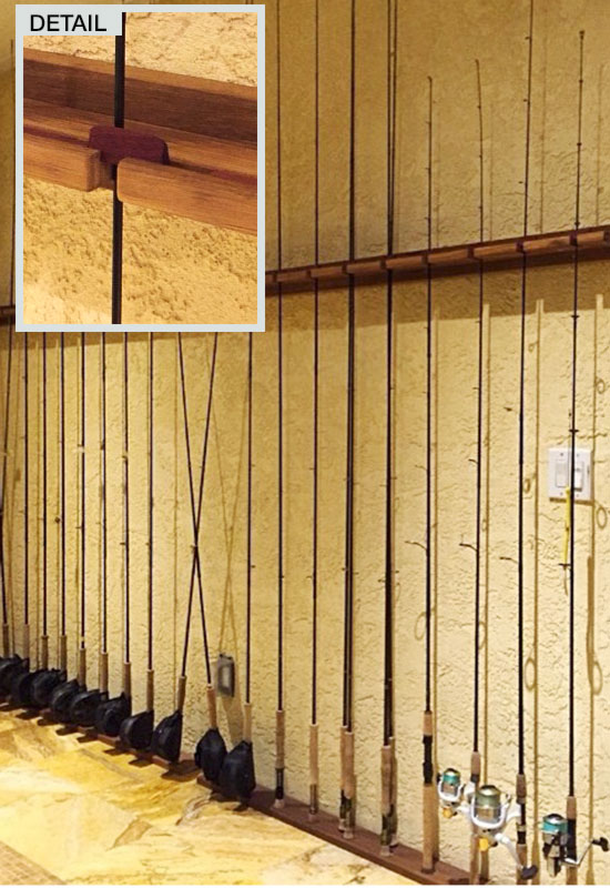 Consist of a floor section with 1/4" rubber feet to prevent drifting and a wall-mounted section with dovetailed rod keeps. Both floor and wall sections are felt-lined where rods make contact. Wall portion comes with a mounting template or fastener-free front.